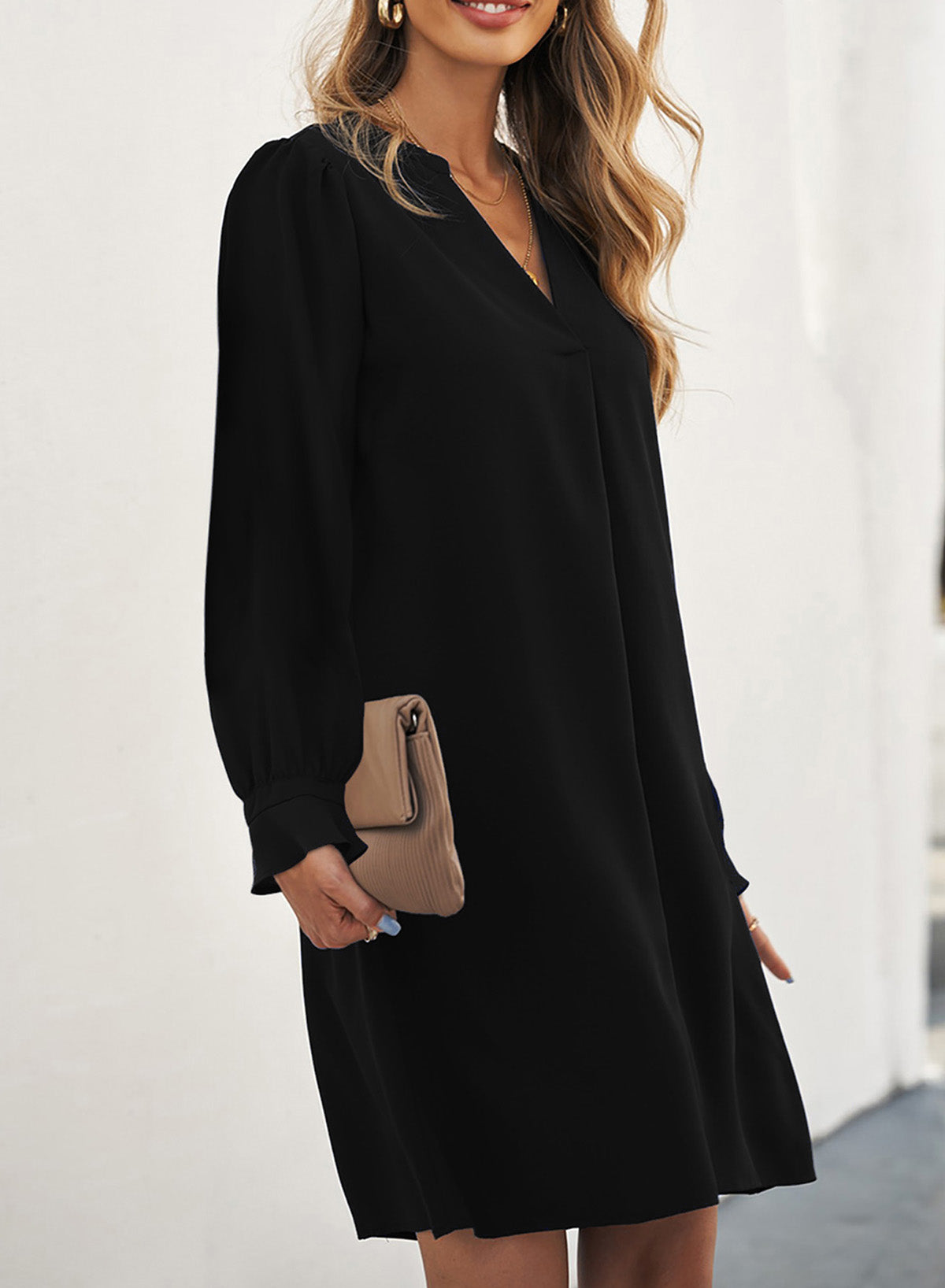 Long Puff Sleeve Notched Neck Dress
